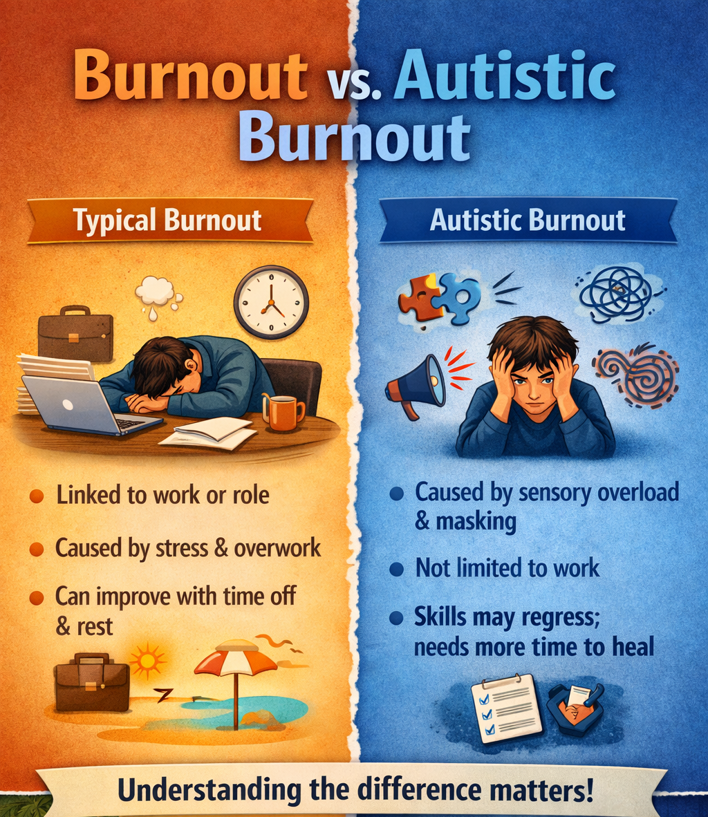 Autistic burnout is different in both cause and impact. It is a state of physical, mental, and emotional exhaustion experienced by autistic people after extended periods of navigating a world not designed for their needs. Ongoing masking, sensory overload, social and communication demands, and lack of appropriate supports slowly accumulate. Autistic burnout is not confined to work and does not resolve with a short break or vacation.