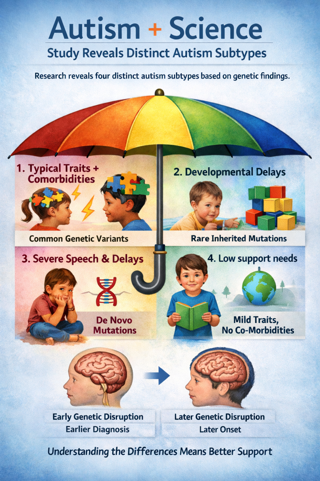 One subtype showed common autism traits such as repetitive behaviors and social challenges alongside conditions like ADHD and anxiety, driven largely by common genetic variants. Another was characterized by developmental delays tied to rare inherited mutations. A third displayed the greatest challenges with speech and more pronounced developmental delays, linked to high-impact spontaneous (de novo) mutations in highly constrained genes. The fourth group typically meet milestones at the same time as neurotypical peers, they do not usually have co-occurring psychiatric conditions, and they present more moderate core autism related behaviors.